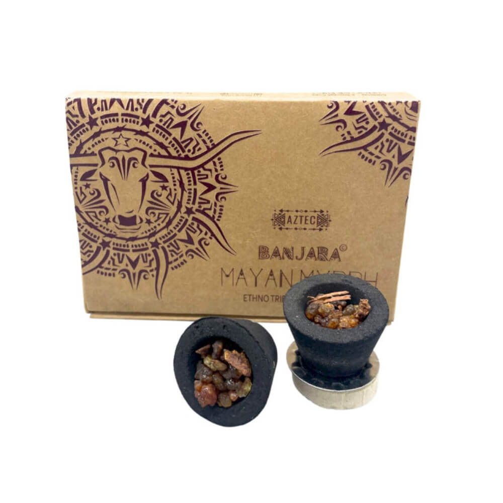 Incenso in resina Banjara "Mayan Myrrh" contenuto in coppini (già pronti per essere utilizzati), una fragranza sacra e meditativa che racchiude il potere antico della mirra, simbolo di guarigione, introspezione e purificazione spirituale.