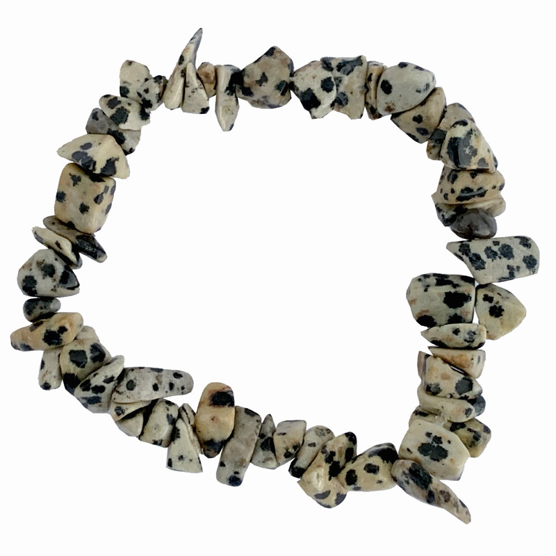 Bracciale elastico realizzato con chips di Dalmantino naturale, proveniente dal Messico. Detto anche Diaspro dalmata, secondo la tradizione rende lo spirito più forte e giocoso, incoraggia ognuno di noi ad essere più allegro e spensierato... Un bracciale moderno ed elegante.