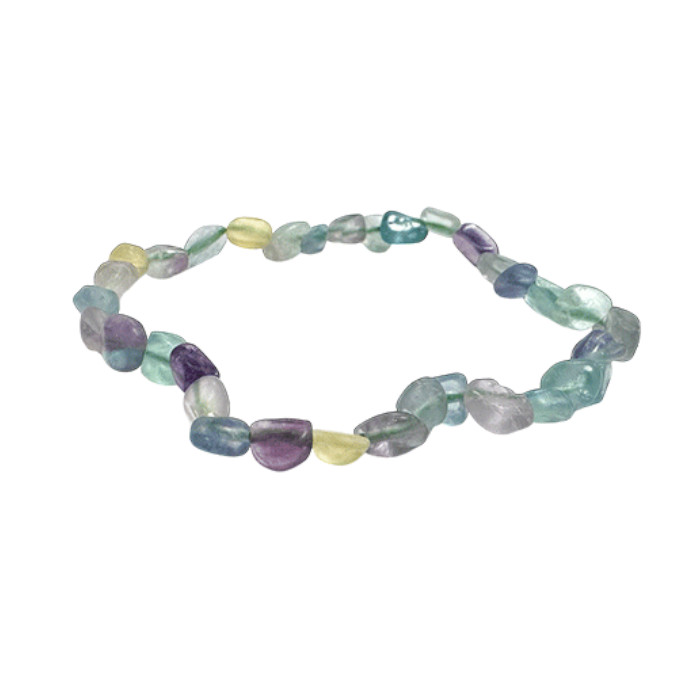 Bracciale elastico lavorato a mano con "pepite" di Fluorite arcobaleno. Trattandosi di una pietra naturale ogni bracciale è un pezzo unico in quanto si differenzia sia per la forma delle "pepite" che per le loro sfumature di tonalità e venature. La Fluorite arcobaleno secondo la tradizione rappresenta lo sviluppo psichico, altamente protettiva e stabilizzatore energetico, aumenta la concentrazione e le intuizioni. Si dice che sviluppi l'autodisciplina e il senso dell'ordine. Sia utile anche per superare dipendenze di varia natura. Circonferenza: 18/19 cm