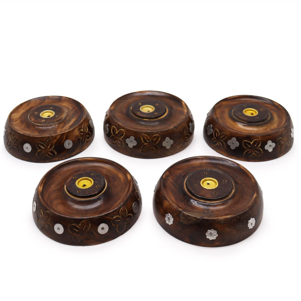 Brucia incenso in legno di Mango, lavorato a mano in India, con intarsi che raffigurano decorazioni floreali e altre forme.