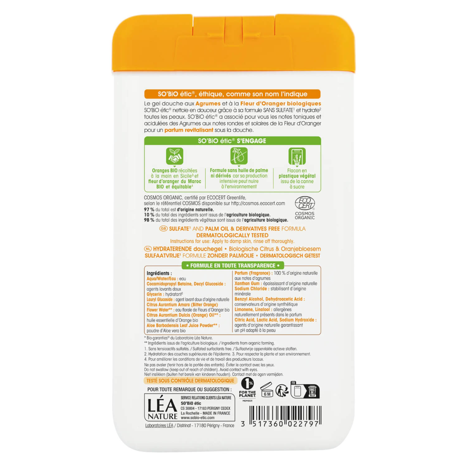 Gel doccia idratante Agrumi & Fiori d’arancio bio, fresco e rivitalizzante, certificato Cosmos organic da Ecocert e Cosmebio