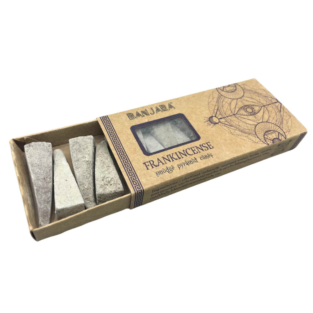 Coni di incenso Frankincense di Banjara, dal profumo ricco, terroso e leggermente agrumato, ideali per creare un’atmosfera di pace e connessione spirituale. Perfetti per la meditazione, favoriscono il rilassamento e la chiarezza interiore.