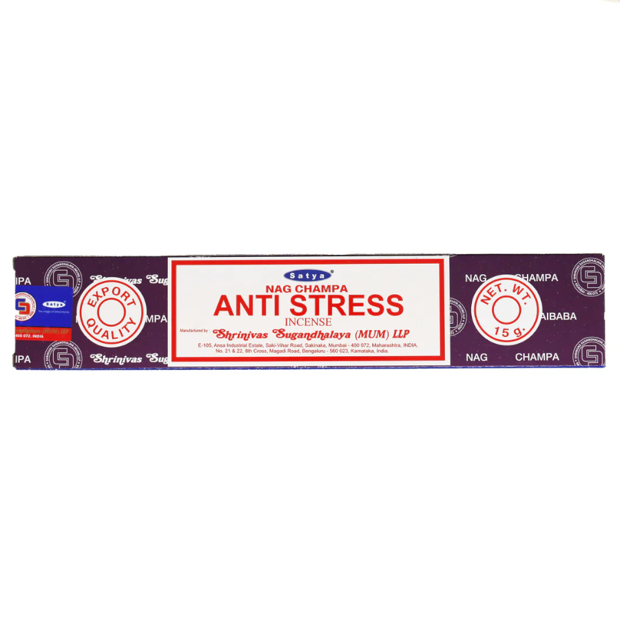 Incenso Satya "Anti-Stress", fragranza armoniosa e rilassante, studiata per sciogliere le tensioni e favorire un profondo senso di benessere.