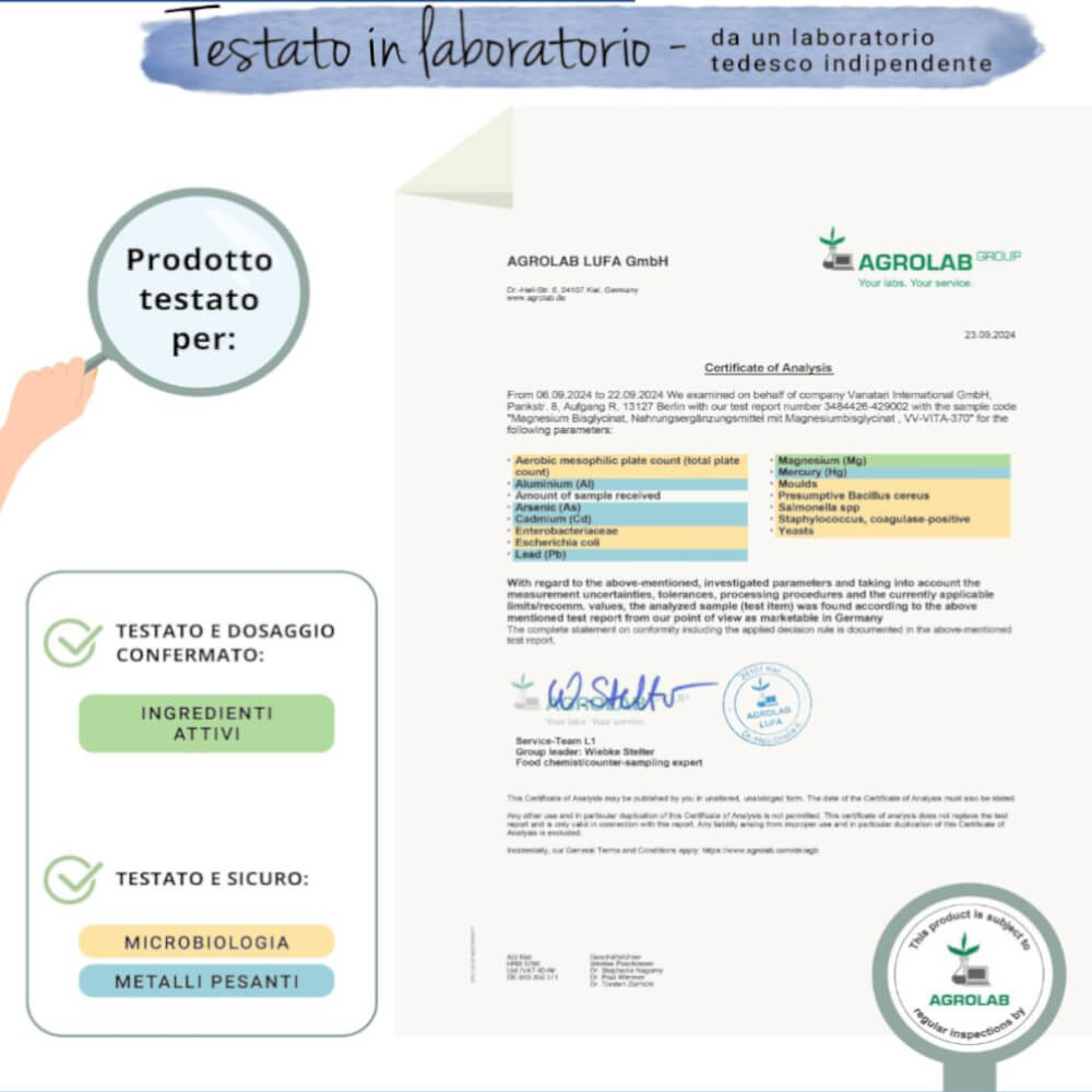 Magnesio bisglicinato: Forma organica altamente assorbibile e delicata per lo stomaco, utile per il benessere di nervi, muscoli e ossa.