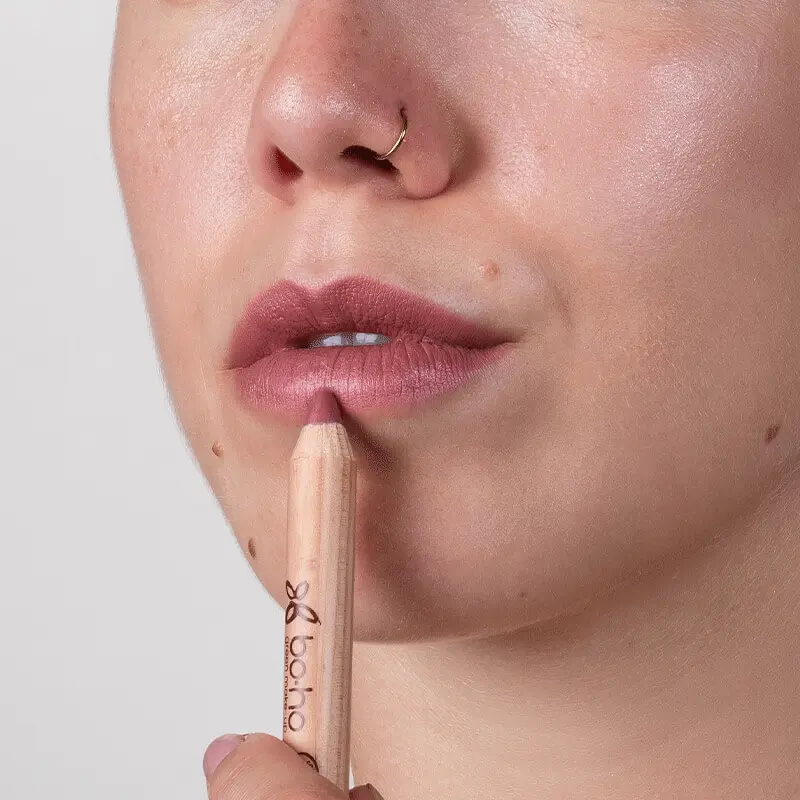 Inizia delineando il contorno delle labbra per una definizione più precisa, consigliamo di utilizzare la Matita labbra 03 Vieux Rose di BoHo.