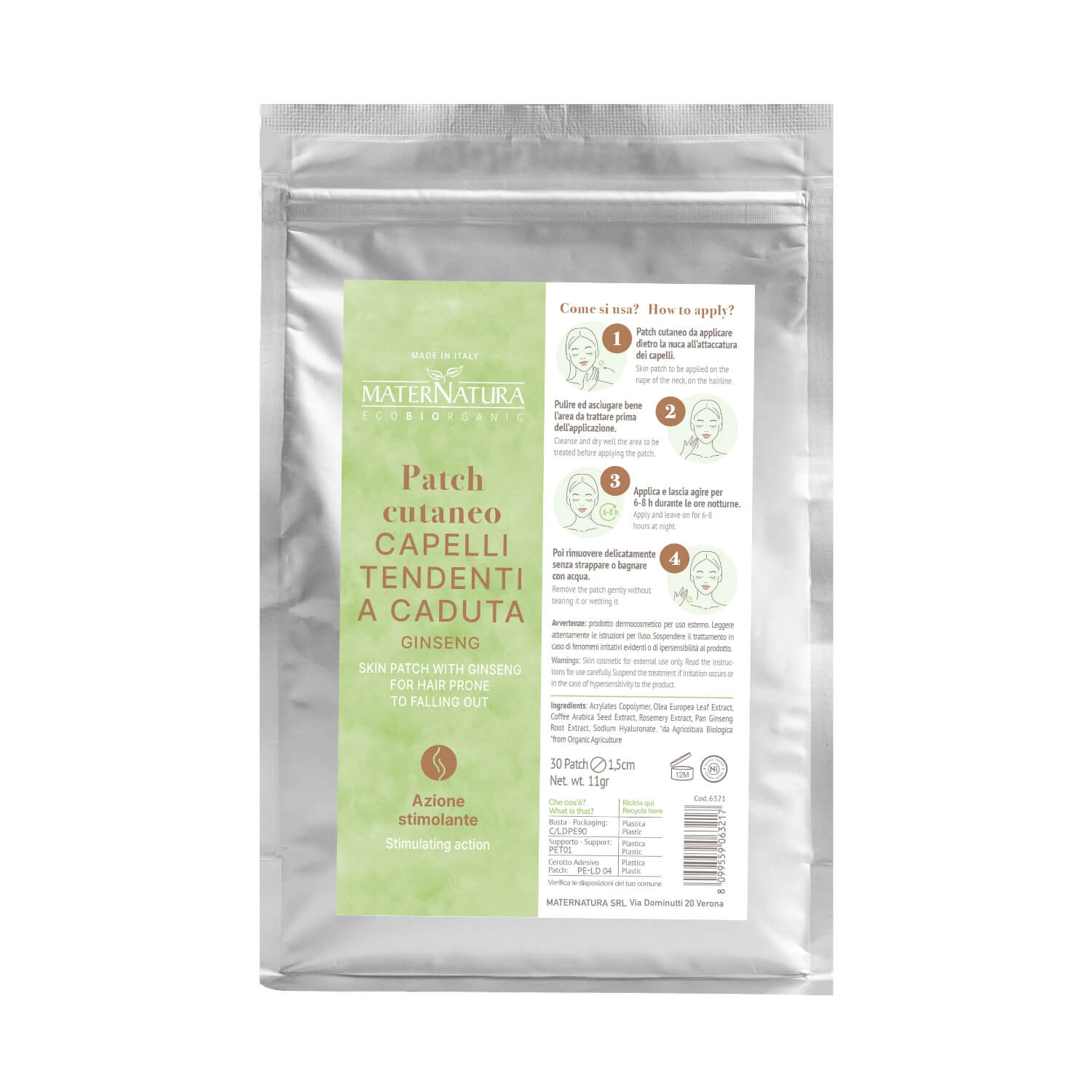La presenza di Acrylates Copolymer (polimero sintetico) garantisce l’adesione del patch e il rilascio graduale dei principi attivi durante la notte.