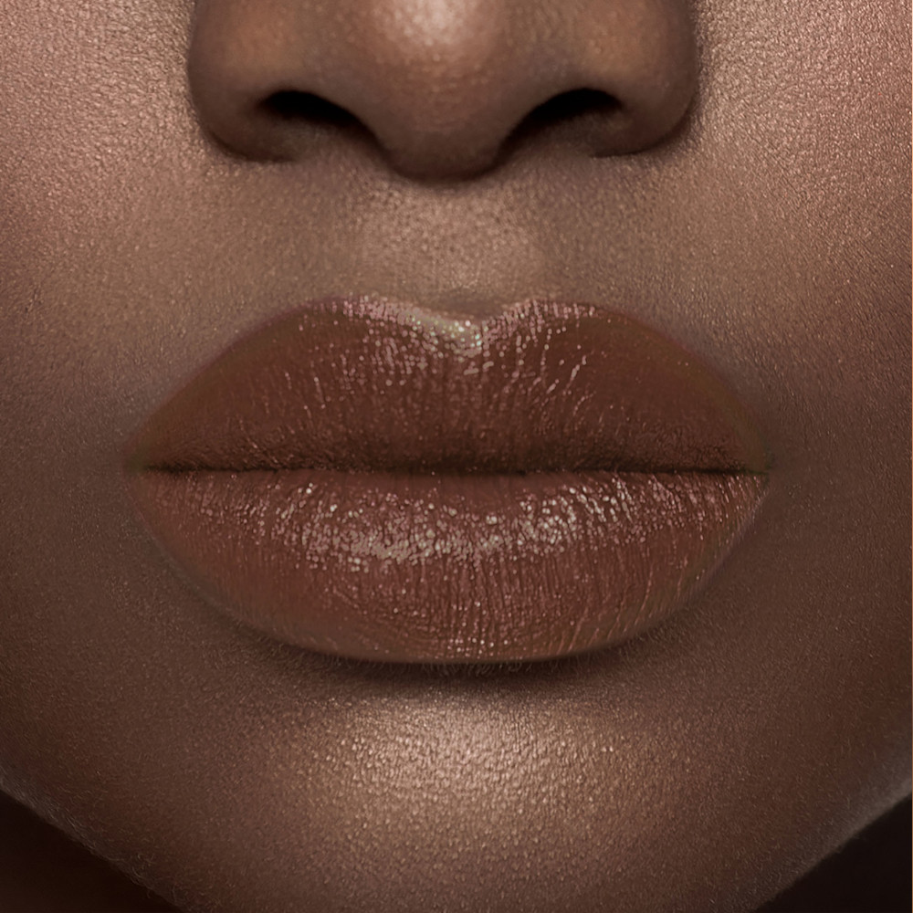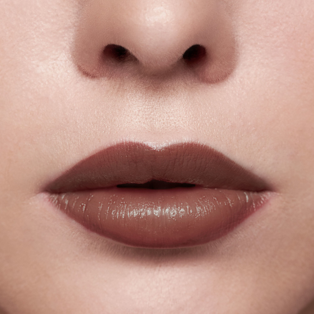 Rossetto marrone nude caldo, sobrio e naturale, con sottotono beige e finitura satinata, una tonalità elegante e versatile, perfetta per esaltare le labbra con discrezione e stile.