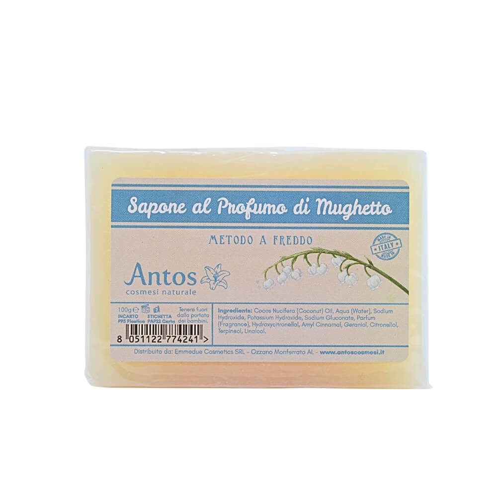 Realizzata artigianalmente con il metodo a freddo, la Saponetta al Mughetto preserva le proprietà degli ingredienti e sviluppa una schiuma cremosa e soffice che deterge senza seccare la pelle.