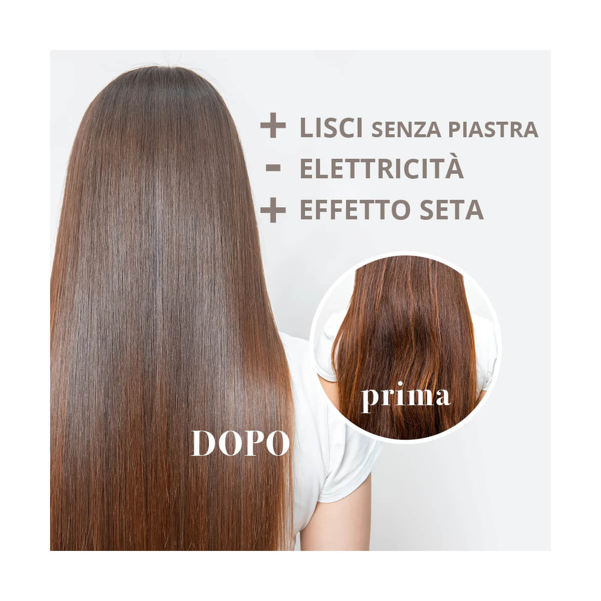 Una combinazione di prodotti sinergici che agiscono in profondità per garantire un effetto liscio duraturo e naturale, senza appesantire i capelli.