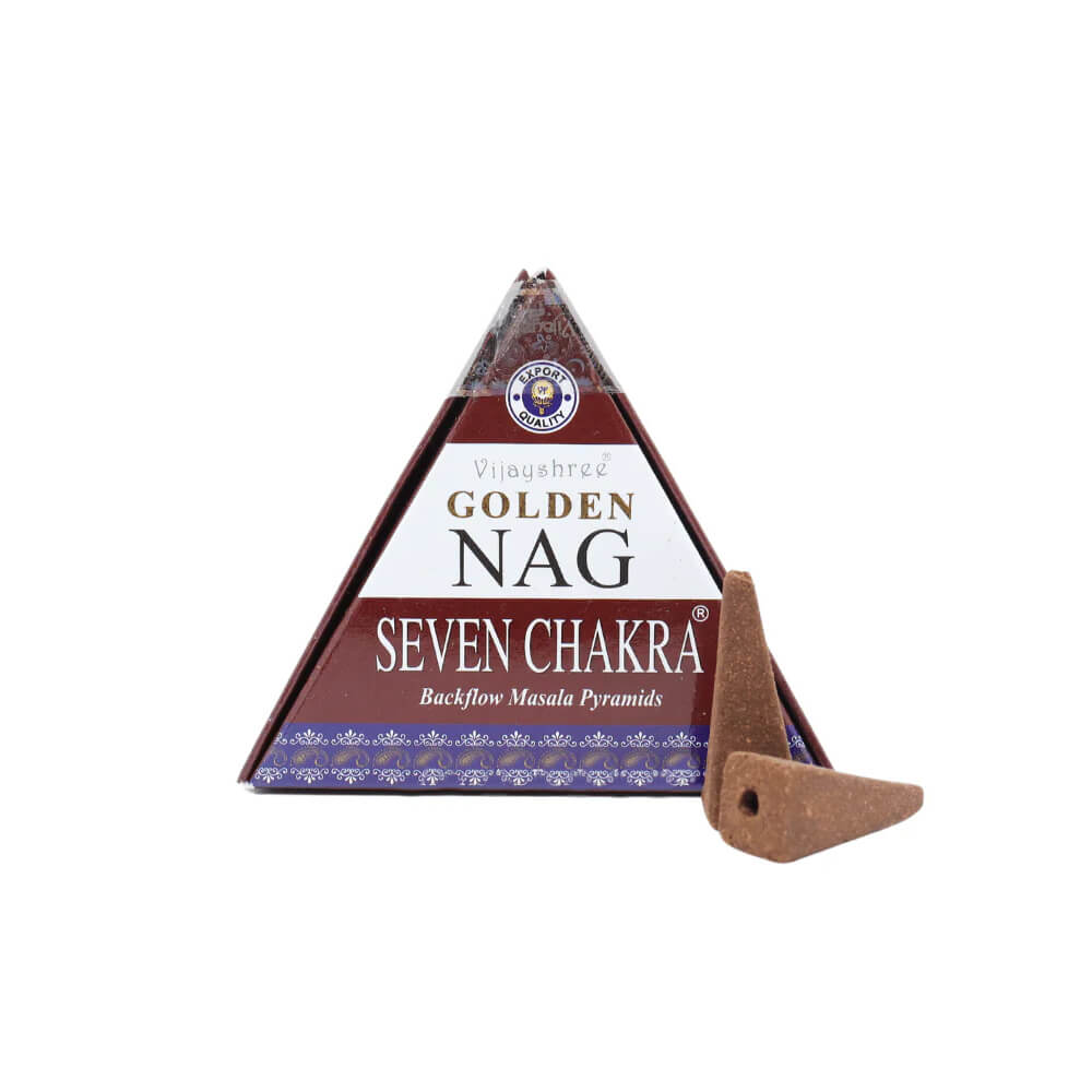 Incenso Vijayshree Golden Nag "Seven Chakra" Backflow, una fragranza intensa e spirituale studiata per accompagnare pratiche di meditazione, yoga e momenti di riequilibrio interiore.